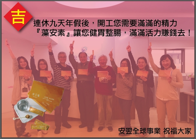 首頁 最新消息 最新消息 【賀】新春開工~ 2019-02-14 【2019 初十開工大吉】 連休九天年假後,開工您需要滿滿的精力 『藻安素』讓您健胃整腸,滿滿活力賺錢去! 安翌全球事業 祝福大家 [ 下一則:好點雲‧智能點餐雲系統 上架了! ] [ 上一則:【公告】過年期間(2/2~2/10)客服暫停服務 ] [ 返回列表 ]
